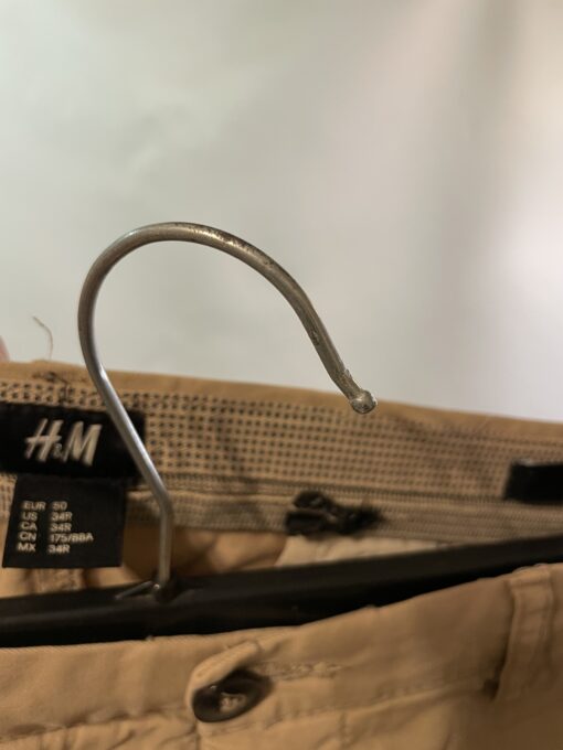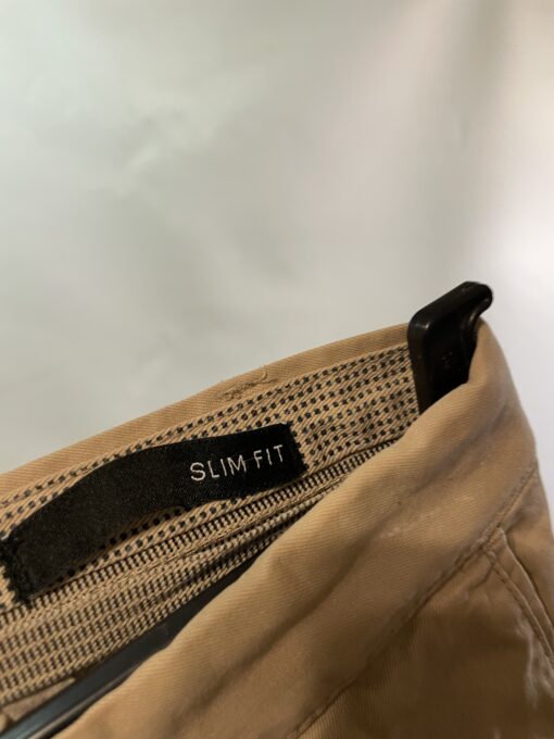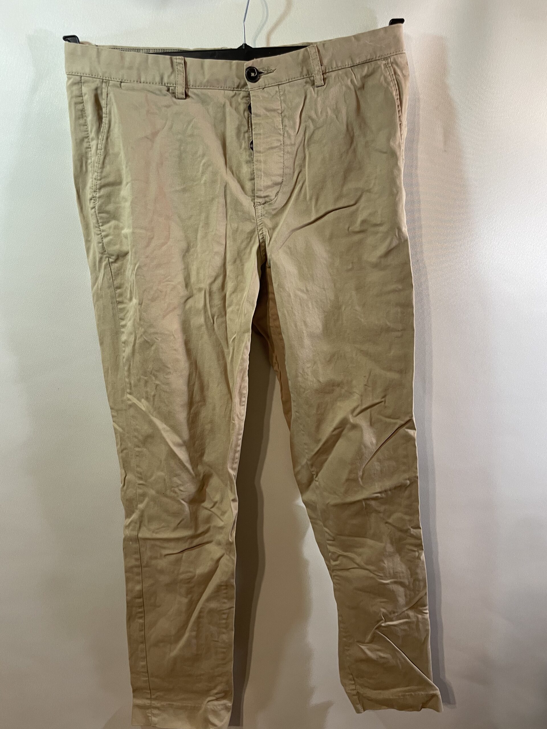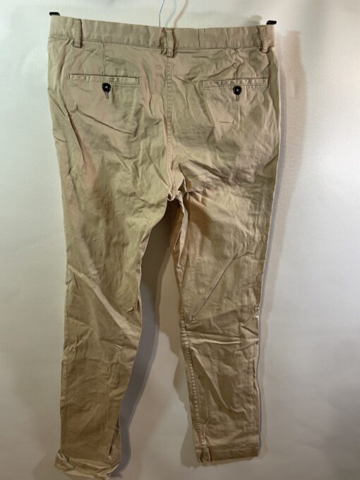 Šīs bēšās vīriešu bikses piedāvā nepiespiestu stilu un praktiskumu vienlaikus. Izgatavotas no viegla, elpojoša kokvilnas auduma, tās ir piemērotas gan ikdienas darbiem, gan atpūtai. Konusveida kāju piegriezums nodrošina modernu siluetu, kas piestāv dažādiem auguma tipiem.Biksēm ir jostas cilpas, sānu kabatas un vienkārša aizdare ar pogu un rāvējslēdzēju. Aizmugures kabatas ar pogcaurumiem (pogas trūkst). Šuves ir neskartas, audums – valkāts, bet vēl labs. Redzamas saburzījuma pēdas. Ideāli piemērotas tiem, kas novērtē ērtu, vienkāršu apģērbu ar neitrālu toni un praktisku pielietojumu.