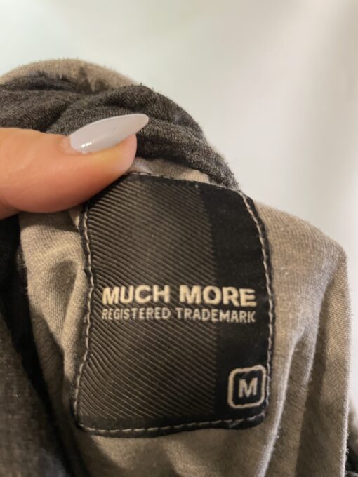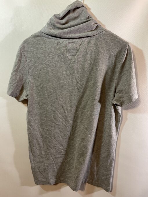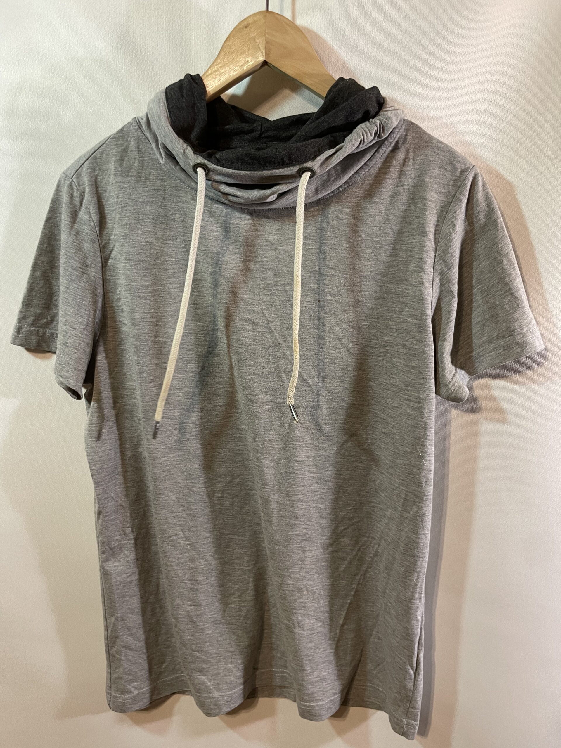 Šis vīriešu T-krekls izceļas ar neparastu dizainu – augstā, divslāņu apkakle ar aukliņām rada kapuces efektu, kas piešķir šim kreklam raksturu. Gaiši pelēkais korpuss kontrastē ar tumši pelēko kakla zonu, radot vizuāli interesantu apģērba stilu. Mīksts, elastīgs audums nodrošina komfortu visa dienas garumā, piemērots gan siltākām dienām, gan kā starpkārta zem jakas. Lietots, bet saglabājies ļoti labā stāvoklī bez redzamiem defektiem.