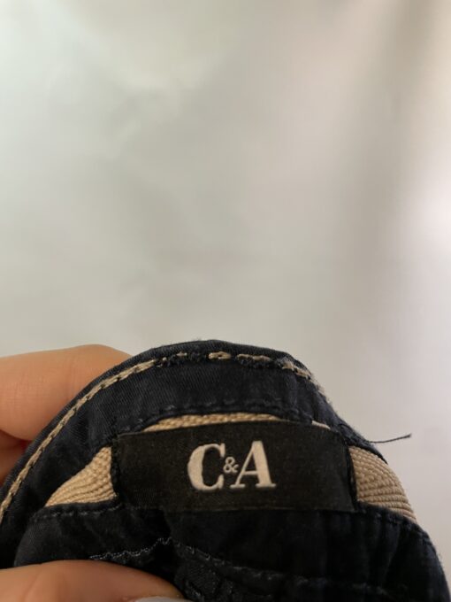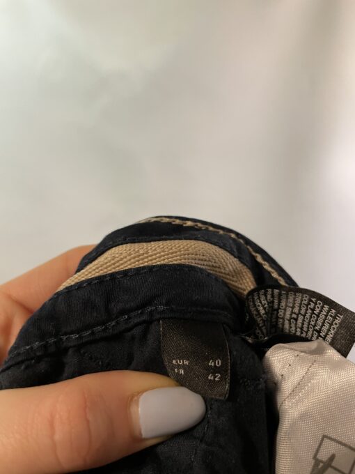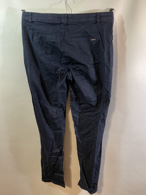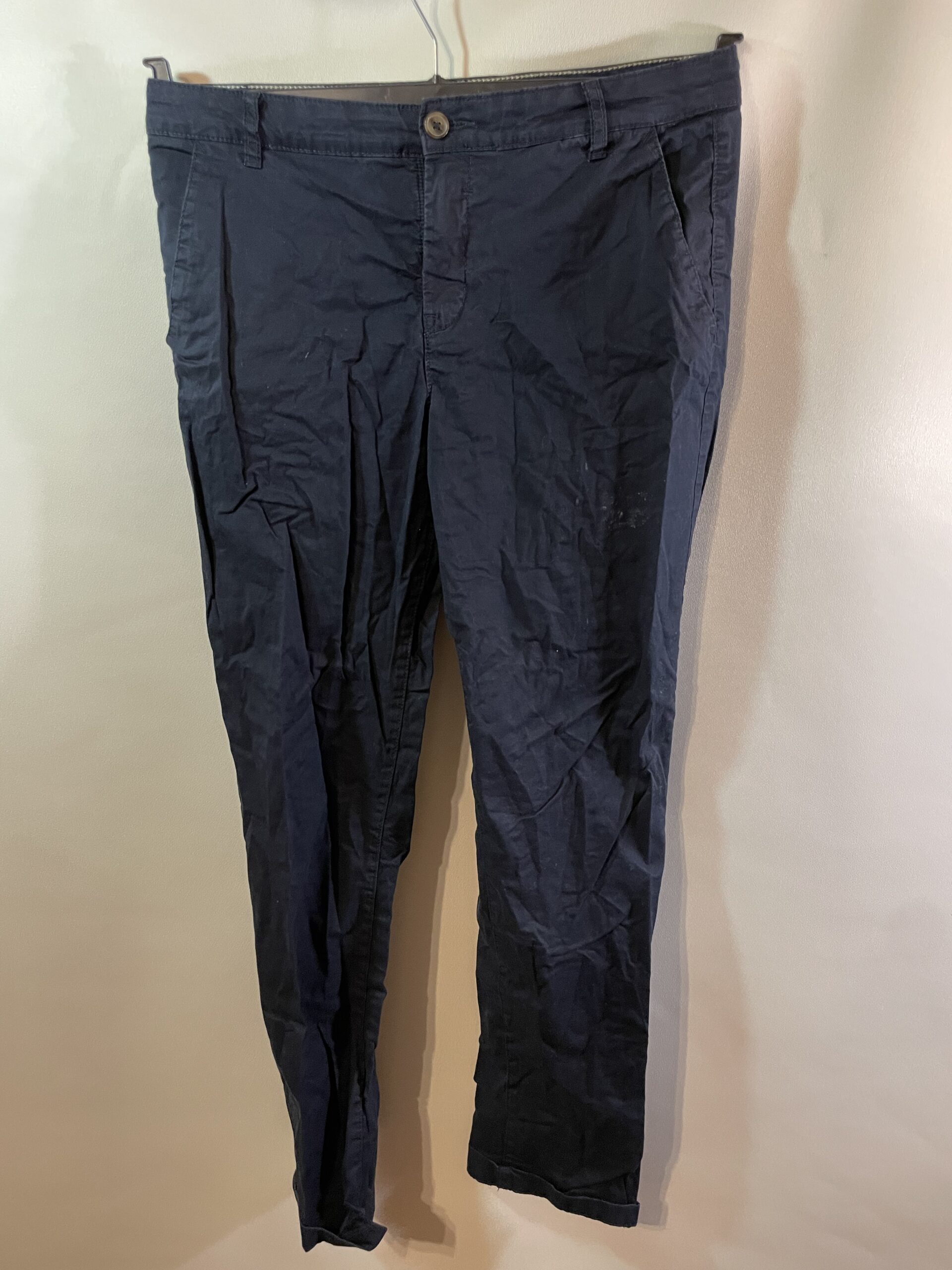 Šīs tumši zilās vīriešu auduma bikses ir lielisks risinājums tiem, kas vēlas saglabāt elegantu izskatu ikdienā. Klasiskais piegriezums nodrošina ērtu valkāšanu, bet tumši zilais tonis padara tās viegli kombinējamas ar dažādiem apģērbiem – gan krekliem, gan džemperiem vai jakām.Bikses aprīkotas ar jostas cilpām, sānu kabatām un aizdari ar pogu un rāvējslēdzēju. Mugurpusē atrodamas kabatu imitācijas vai funkcionālas kabatas (nav redzams skaidri). Materiāls ir mīksts, iespējams ar nelielu elastību, kas nodrošina papildus komfortu. Stāvoklis: lietotas, ar minimālām vizuālām lietošanas pazīmēm, saglabātas labā valkājamībā.