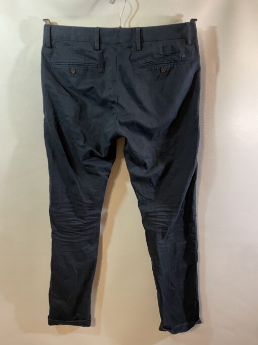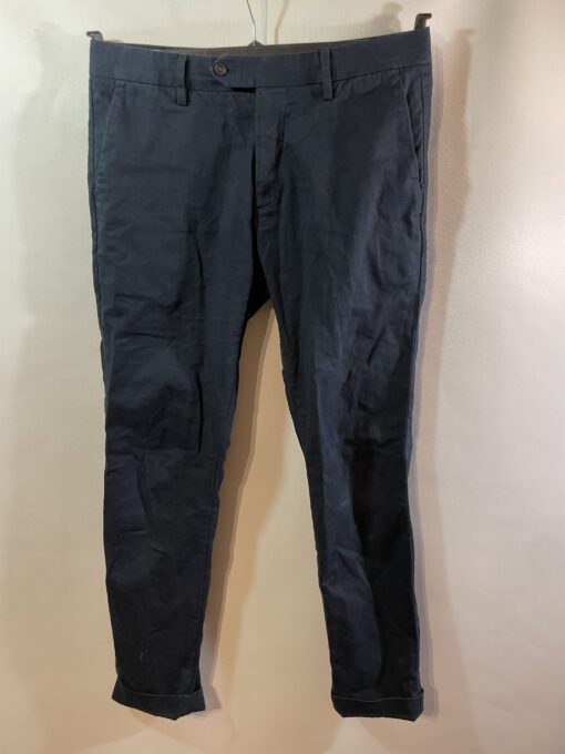 Šīs vīriešu chino bikses ir stilīgs un daudzpusīgs apģērba gabals. Tumši zilā krāsa ir viegli kombinējama ar dažādiem krekliem un apaviem, padarot tās piemērotas gan darbam, gan brīvā laika pavadīšanai. Taisns piegriezums ar klasisko rāvējslēdzēja un pogas aizdari, jostas cilpām un sānu kabatām.Bikses ir lietotas, taču labā vizuālā stāvoklī – redzamas vienīgi saburzījuma pēdas un neliels nēsājuma efekts. Materiāls (pēc izskata) ir mīksts, ar iespējamu elastāna piejaukumu, kas nodrošina ērtu valkāšanu.