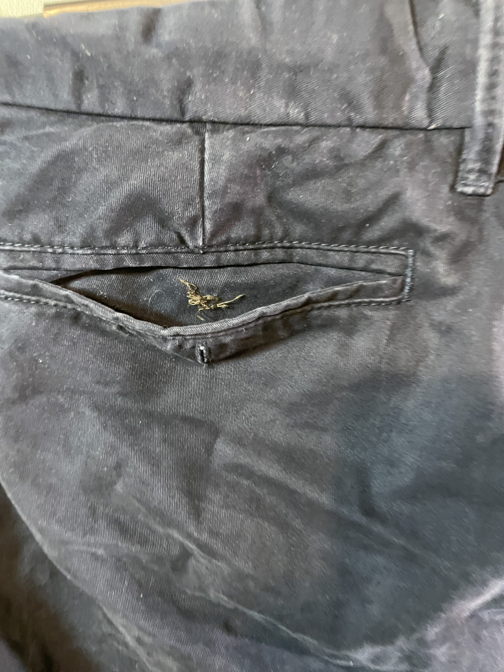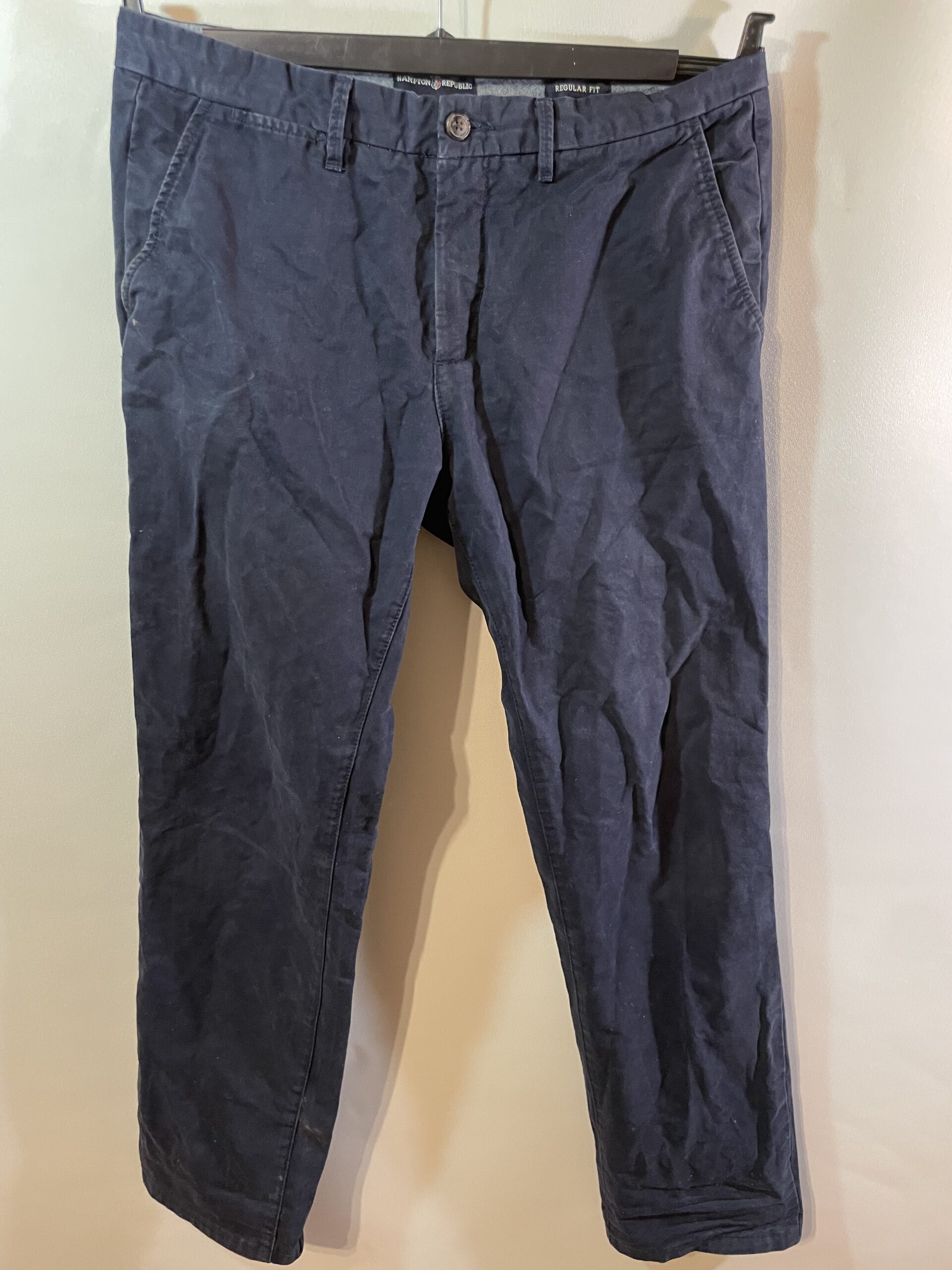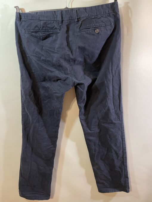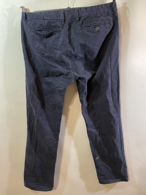 Vīriešu chinos stila bikses tumši zilā tonī no Banana Republic. Klasisks piegriezums un materiāls nodrošina komfortu, bet defekti – izbalējumi un kabatas vīles atplīsums – tiek atspoguļoti cenā.