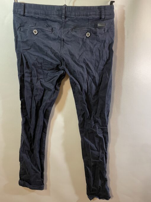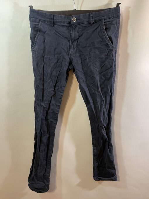 Šīs vīriešu bikses ir praktisks garderobes pamatelements – tās ir vienkāršas, taču stilīgas. Tumši zilā krāsa padara tās viegli kombinējamas ar dažādiem apģērbiem, gan formāliem, gan ikdienišķiem. Taisns, nedaudz pieguļošs piegriezums nodrošina ērtumu kustībā.Biksēm ir klasiskas sānu kabatas, jostas cilpas un viena poga ar rāvējslēdzēja aizdari. Mugurpusē ir kabatas. Materiāls šķiet kokvilnas bāzes – elpojošs un patīkams ādai.Redzamas krokas no glabāšanas, bet pēc izgludināšanas iegūs atbilstošu izskatu. Laba izvēle tiem, kas novērtē praktiskumu un vienkāršību.