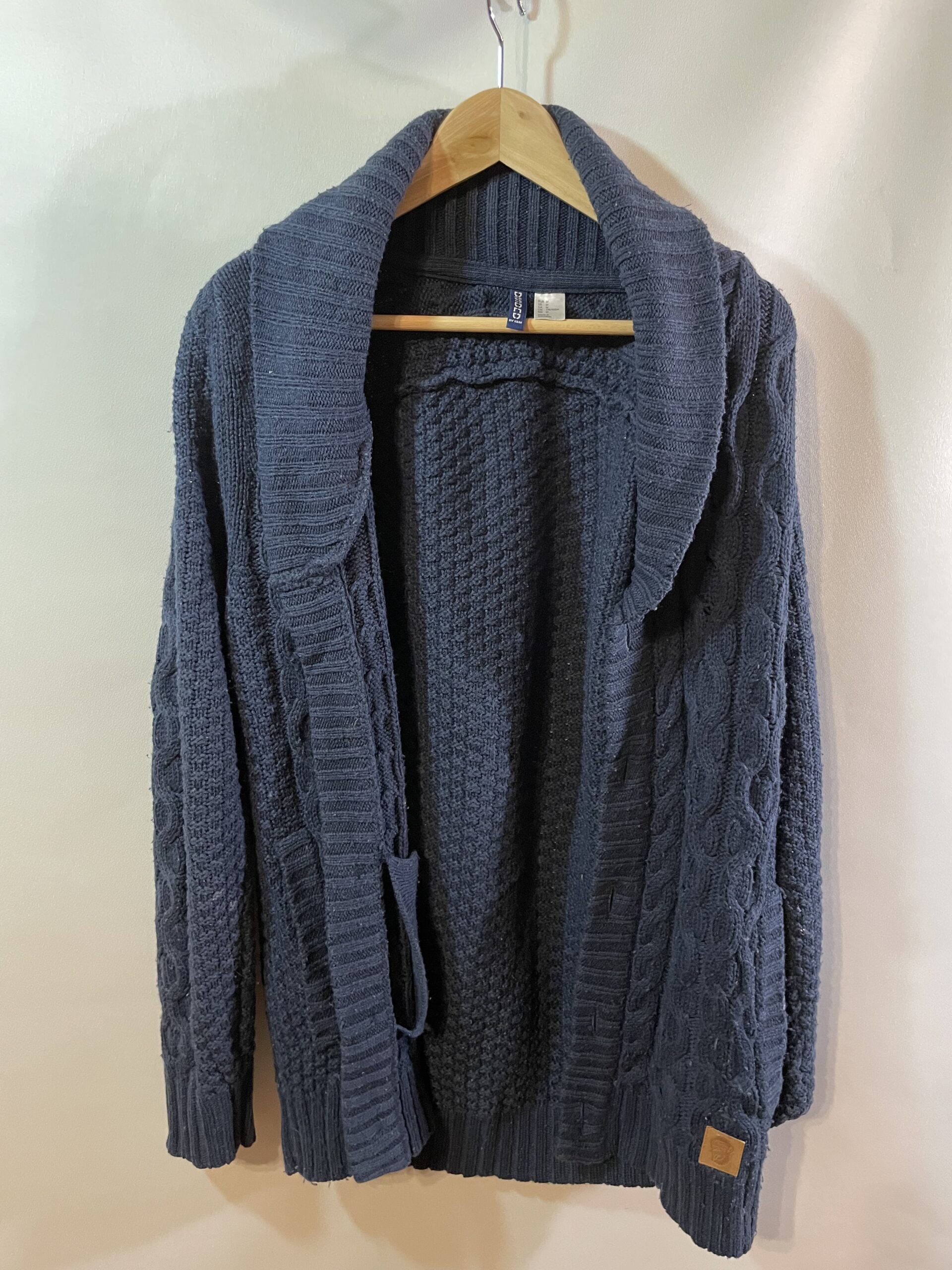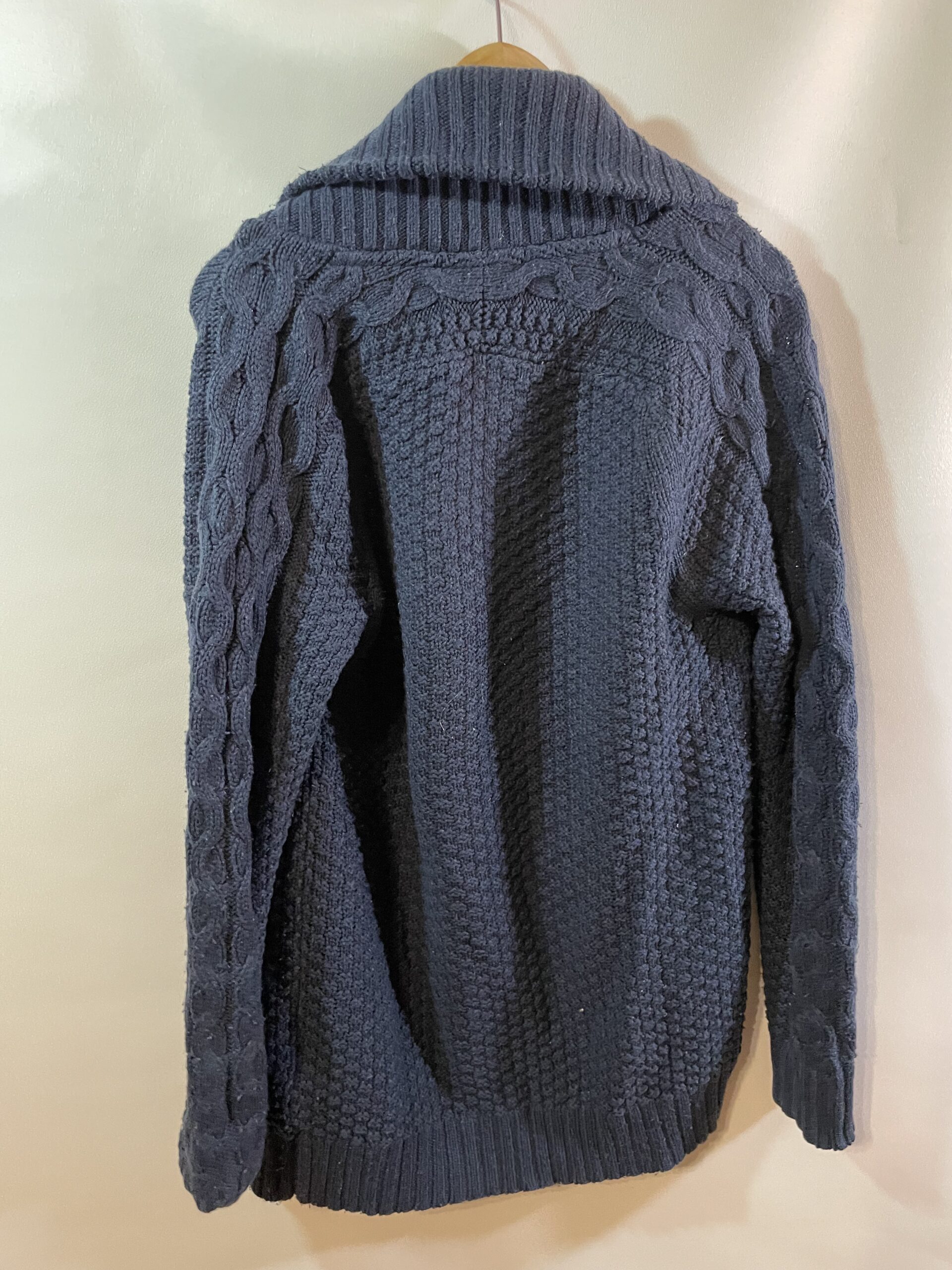 Silts un komfortabls adīts vīriešu džemperis ar jostu un platām atlokāmām apkaklēm. Ideāli piemērots ziemas sezonai vai atpūtai mājās. Laba stāvoklī, ar smalku rakstu faktūru.