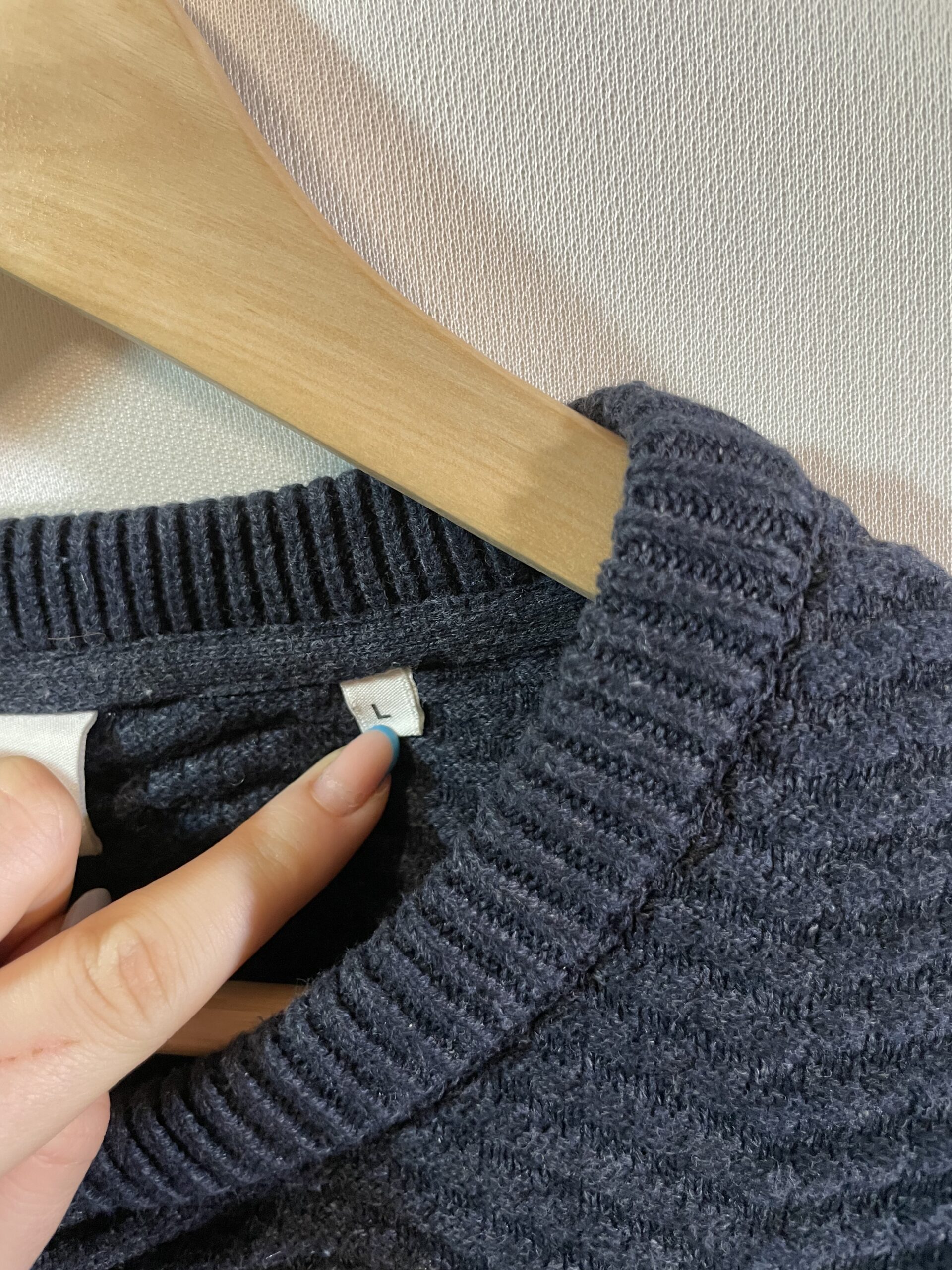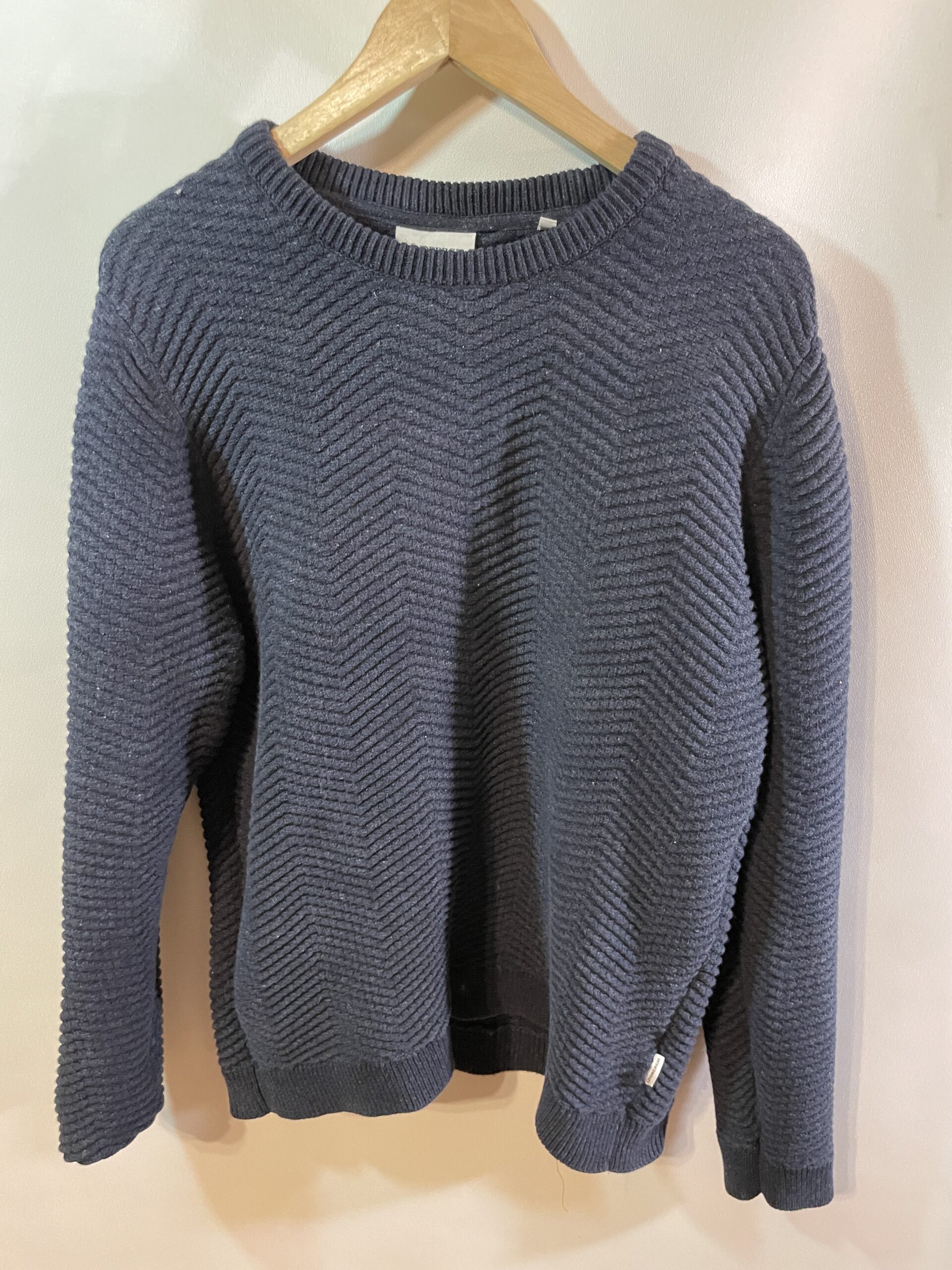 Šis vīriešu džemperis izceļas ar izteiksmīgu tekstūru – eglīšu jeb “Chevron” rakstu, kas piešķir apģērbam dinamisku, modernu izskatu. Tumši zilā krāsa ir klasiska un viegli saskaņojama ar dažādiem apģērba gabaliem. Piegriezums ir vienkāršs un komfortabls, piemērots gan ikdienas valkāšanai, gan nedaudz formālākām situācijām. Materiāls ir silts un piemērots rudenim vai ziemai. Lai arī zīmols nav norādīts, džemperis izskatās kvalitatīvs un saglabājis labu stāvokli.