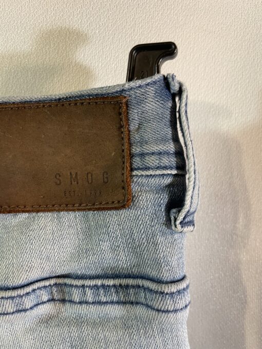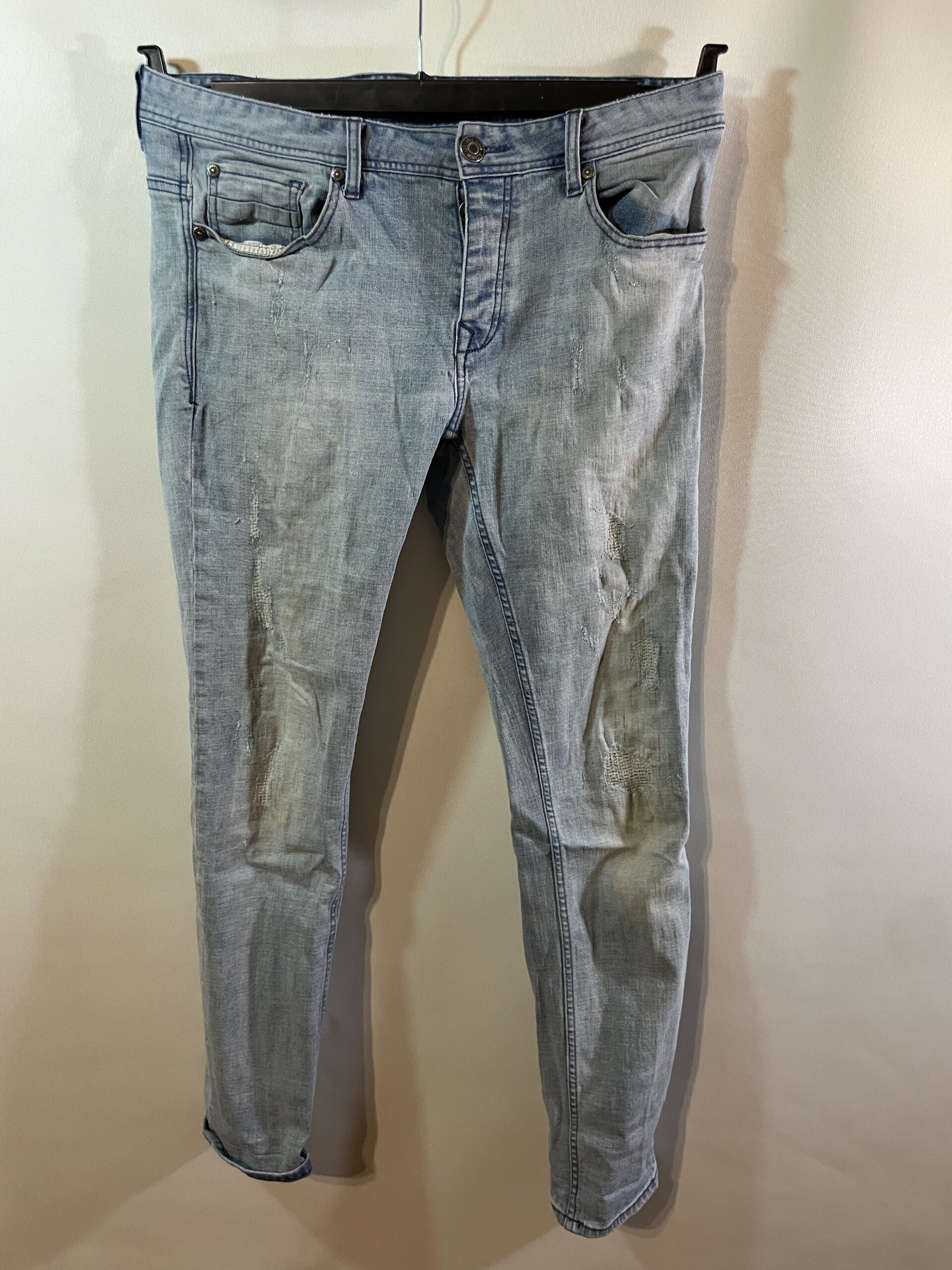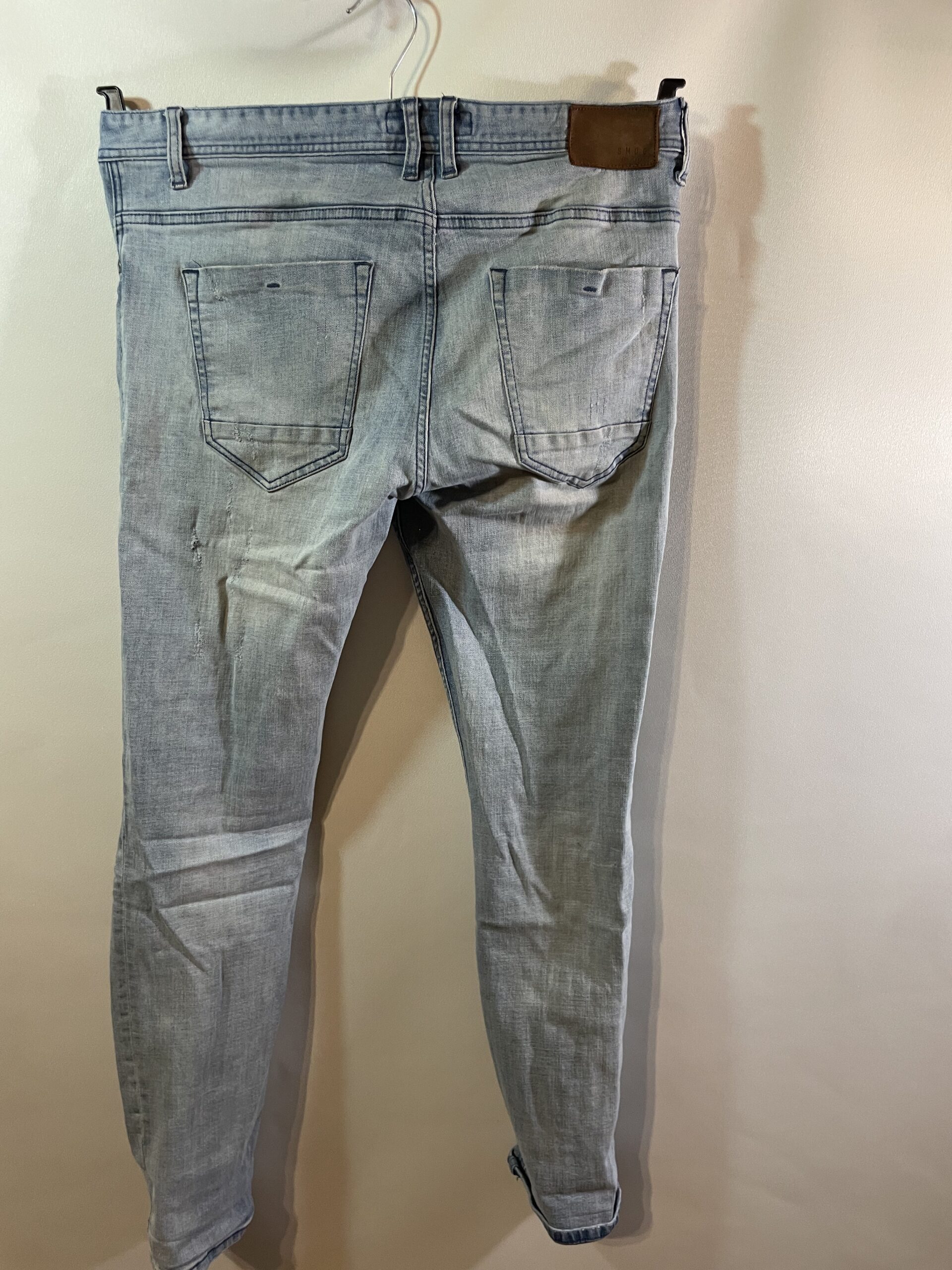 Šīs vīriešu džinsa bikses ir veidotas ar nodiluma efektu, kas piešķir tām modernu, nedaudz neformālu izskatu. Materiāls šķiet vidēji biezs, piemērots ikdienai visas sezonas garumā. Biksēm ir klasisks džinsu griezums ar jostu cilpām un piecām kabatām – divas aizmugurē, divas priekšā un viena monētu kabata. Priekšpusē redzamas vairākas vietas ar apzinātu nodilumu, kā arī neliels plankums pie labā ceļgala. Vizuāli — ieturēts, stilīgs džinsu modelis ar raksturu.